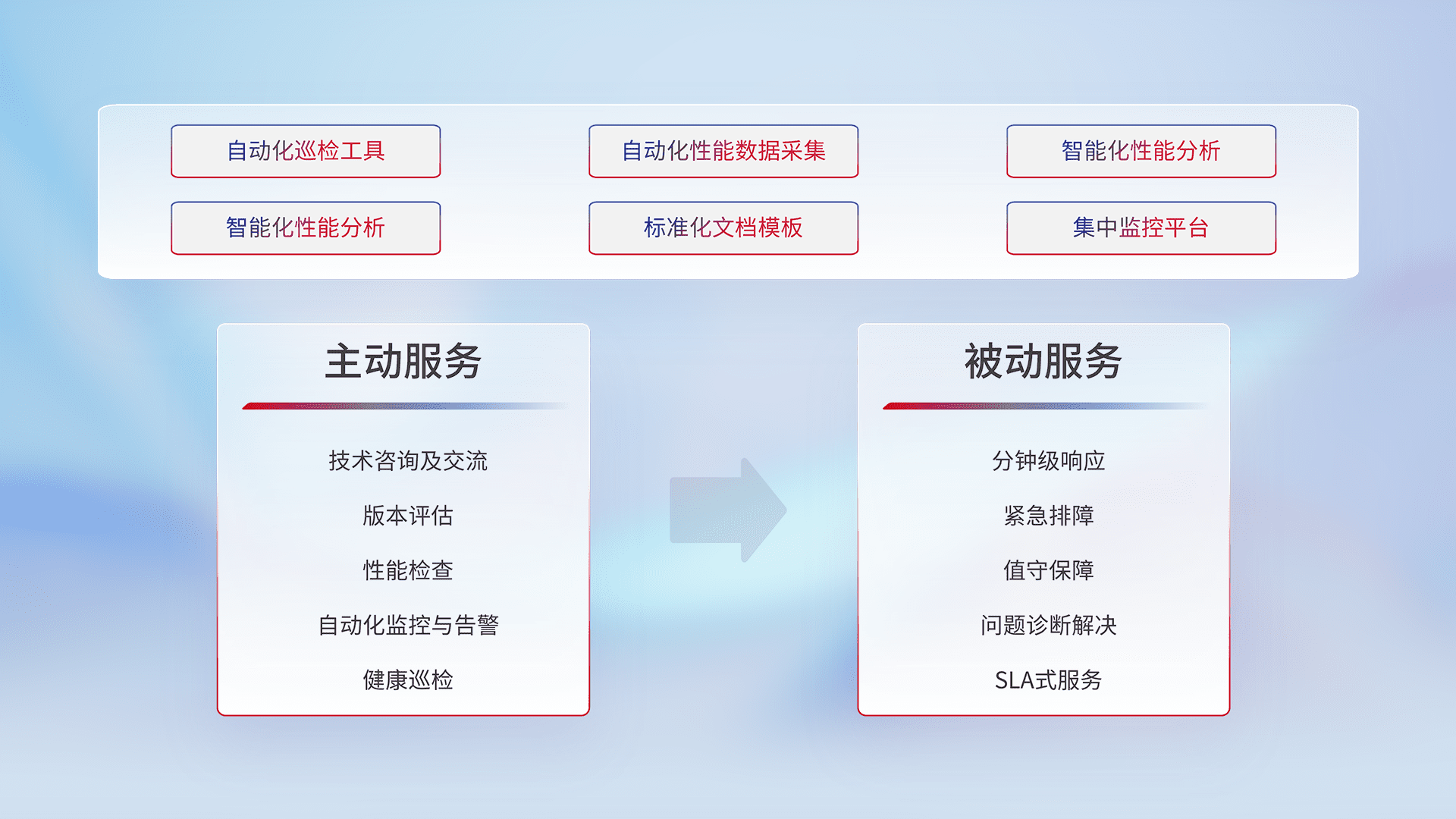 智能化工具和标准化文档,,,,保障服务质量,,,提供主动服务(包含技术咨询、、、版本评估、、、性能检查、、、自动化监控与告警、、、、健康巡检)和被动服务包含(分钟级响应、、、紧急排障、、、值守保障、、问题诊断解决、、、SLA服务)。。
